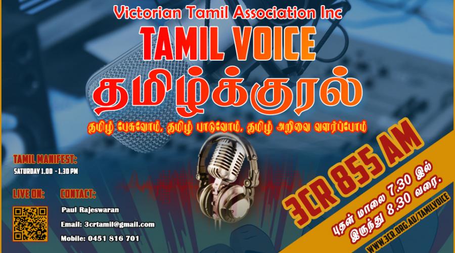 Tamil Voice is a weekly radio program airing on 3CR community radio with news, views, children’s programs and music presented by The Victorian Tamil Association. Tamil Voice serves the interest of the Tamil Community in the Melbourne metropolitan area.
